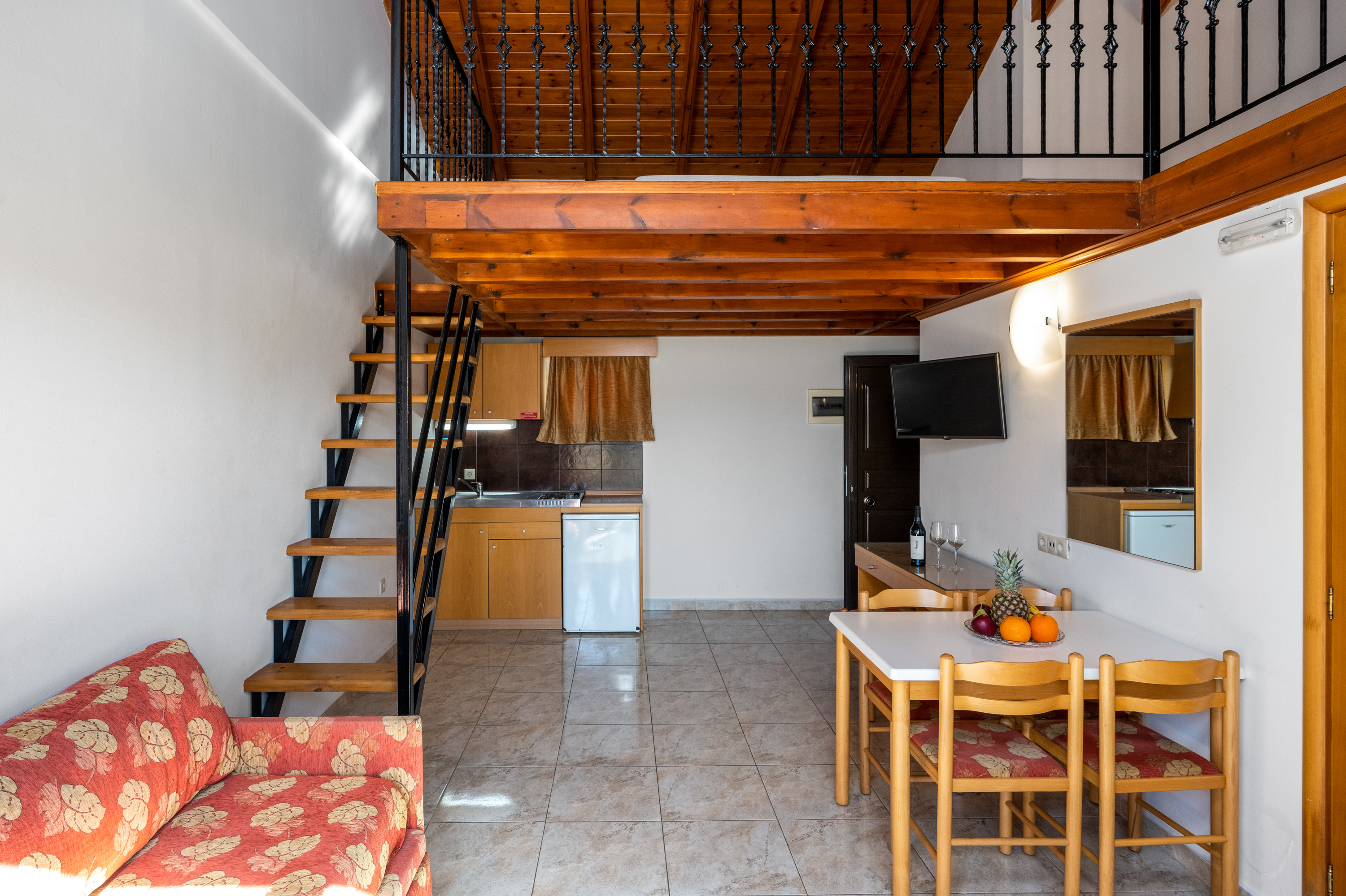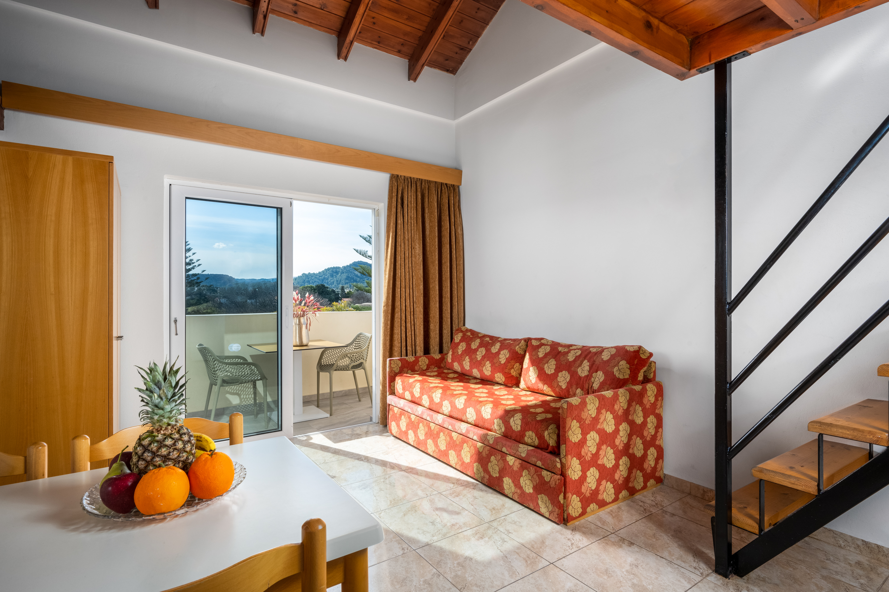 Our maisonettes are designed to cater for the holiday needs of families or friends up to four (4) people. They have two levels that are connected with an indoor staircase. The upper level is used as the bedroom and the lower level as a kitchen lounge area. In our maisonettes there is a fully equipped kitchen with cooking hobs, fridge,utensils and a dining table. Also there is a 32″ flat screen tv, safe box and wifi.